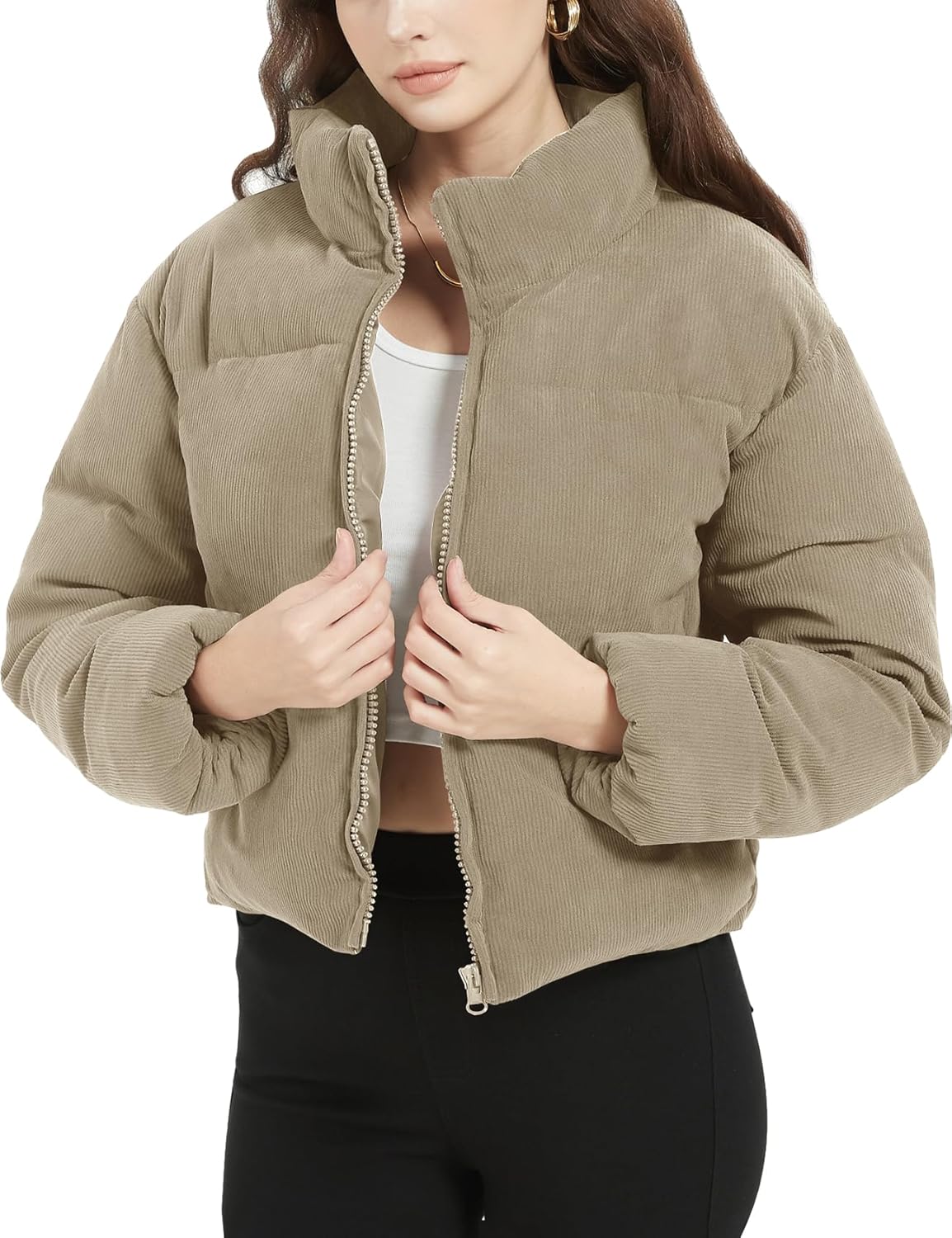 - Match – Versatile short bubble coats can be styled with tshirts, hoodie, jeans, leggings, knee boots, etc, easy dressed up or down, winter coats for women will give you a stylish and comfy fit, warm down jackets, zip up crop corduroy jackets